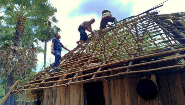 Usai perbaikan rangka atap, pekerjaan pun dilanjutkan dengan pemasangan daun lontar. Bhabinkamtibmas pun berjanji membantu warga binaannya hingga proses perbaikan selesai.