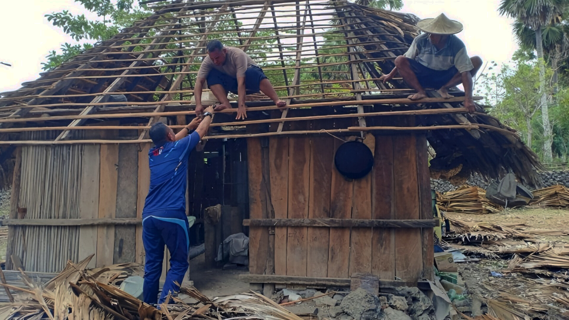 Usai perbaikan rangka atap, pekerjaan pun dilanjutkan dengan pemasangan daun lontar. Bhabinkamtibmas pun berjanji membantu warga binaannya hingga proses perbaikan selesai.