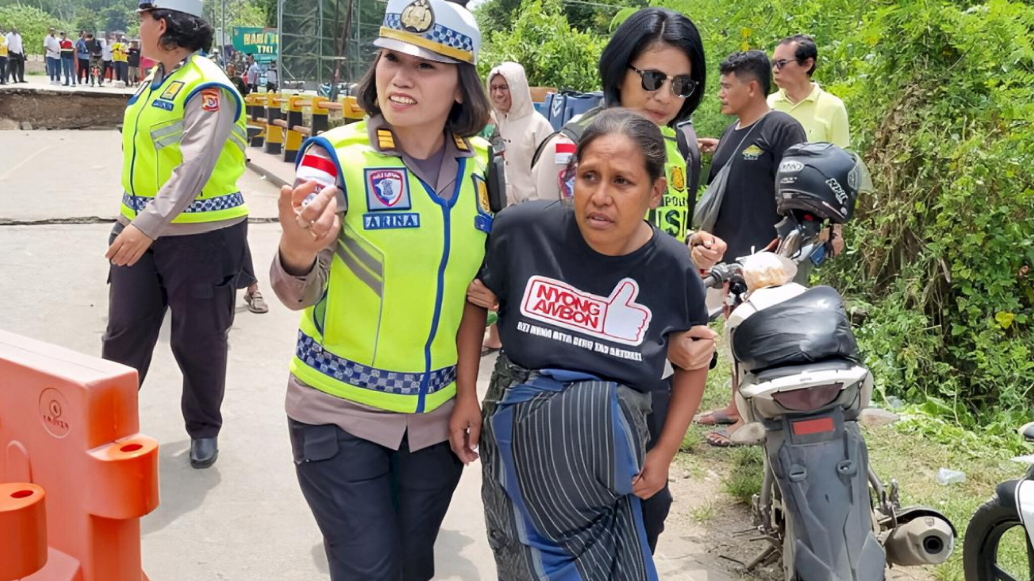 Dengan penuh kehati-hatian dan kepedulian, Polwan bersama anggota lainnya membantu membawa ibu tersebut melewati area jembatan yang rusak dan menuntunnya menaiki mobil Lantas.