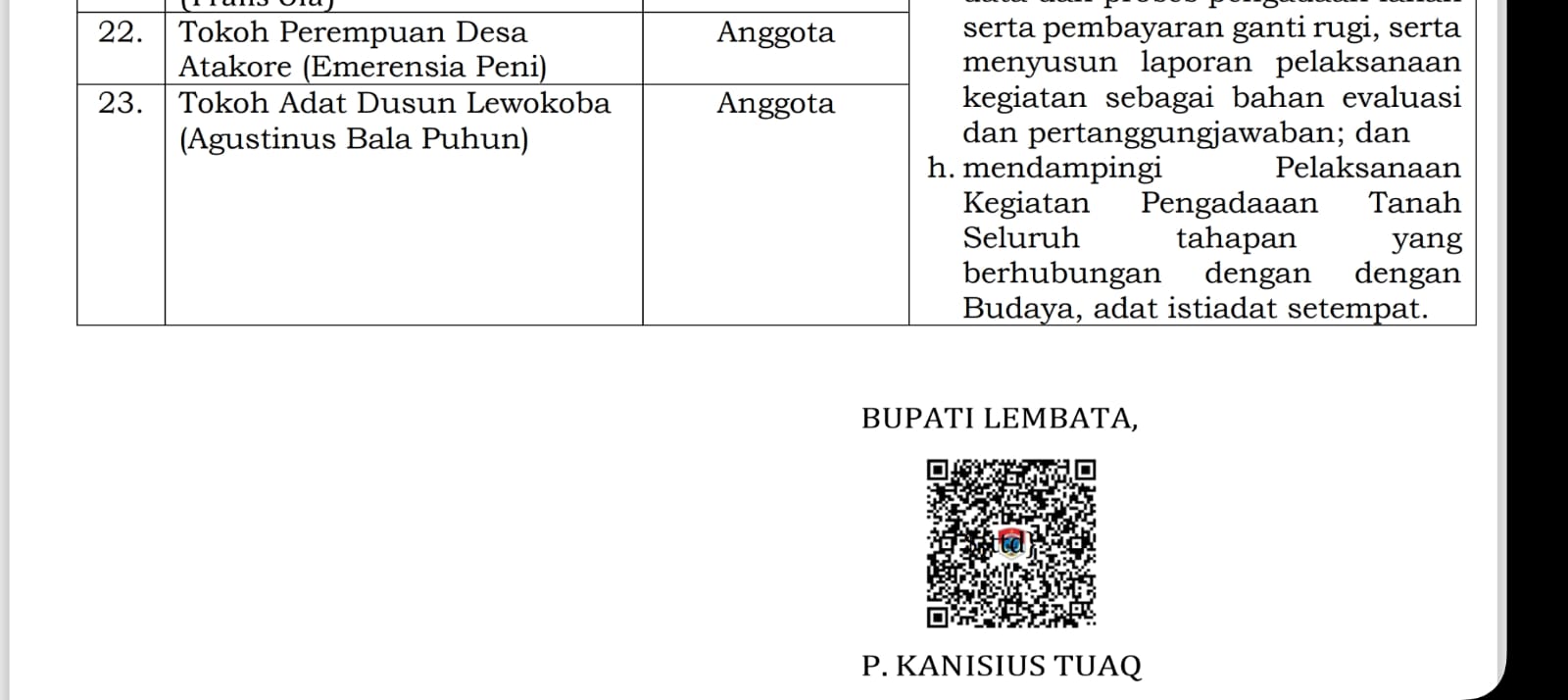 Agustinus Bala Puhun, terdaftar menjadi anggota ke-23, pada Bidang Pengadaan Lahan dan Ganti Rugi, di bawah koordinator Camat Atadei.