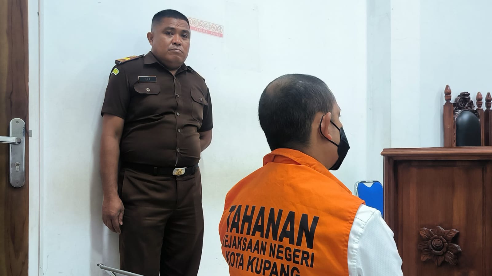 Terdakwa Fajar, mengenakan rompi tahanan, dikawal petugas saat di ruang tunggu Pengadilan Negeri Kelas IA Kupang, menanti giliran sidang, pada Senin 30 Juni 2025. dok. Istimewa.
