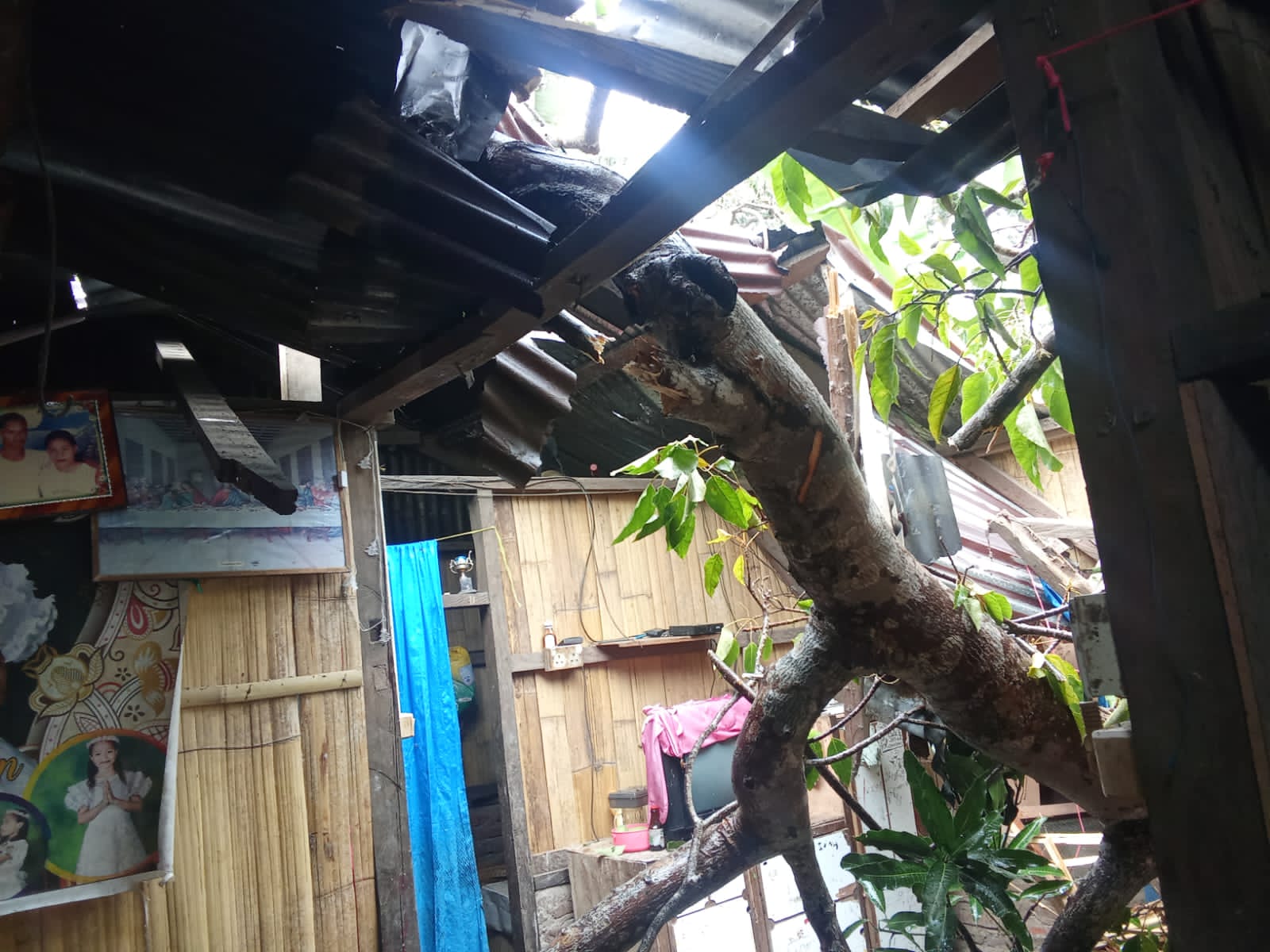 Selain atap sengnya robek dan kayu-kayunya patah,   2 lemari berisi perabotan rumah tangga juga rusak dan menghancurkan peralatan makan.